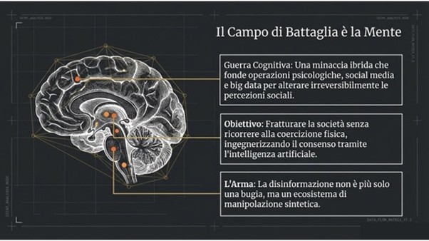 Oggi, tuttavia, non ci troviamo più di fronte a semplici alterazioni analogiche. La convergenza tra conflitti armati, reti sociali e Intelligenza Artificiale Generativa ci ha proiettato in un'era inedita: l'epoca della guerra cognitiva. Una forma di conflitto ibrido che mira a frammentare le società, polarizzare le comunità e logorare le menti, operando non sui campi di battaglia tradizionali ma nei circuiti neurali e algoritmici delle masse. L'UNESCO ha definito questa crisi globale "disordine dell'informazione", distinguendo tra misinformazione (diffusione involontaria di falsità), disinformazione (menzogna diffusa con dolo) e malinformazione (uso strumentale di dati reali per recare danno). In scenari come l'Ucraina, Gaza e il recente conflitto in Iran, questo disordine non è accidentale: è un'arma sapientemente manovrata da apparati statali.