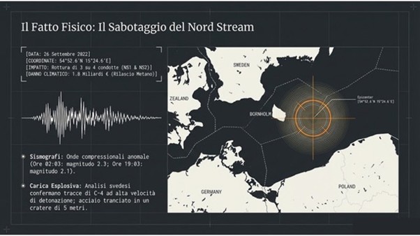 L'apice della convergenza tra guerra fisica e guerra dell'informazione si materializza nel caso dei gasdotti Nord Stream 1 e 2, sabotati il 26 settembre 2022 nel Mar Baltico. L'evento, il più grave attacco alle infrastrutture critiche europee dalla Seconda guerra mondiale, dimostra come la nebbia della guerra sia oggi amplificata dalla disinformazione. In quel giorno di settembre i sismografi registrarono eventi inequivocabili: esplosioni sottomarine in grado di squarciare acciaio e cemento, generando crateri di venti metri cubi. Le stime indicano cariche pari a 500-750 chilogrammi di tritolo, fatte brillare a oltre settanta metri di profondità. L'impatto ambientale fu devastante: il rilascio di metano equivalse a un terzo delle emissioni annuali dell'intera Danimarca.