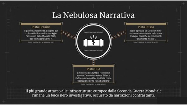 Eppure, lo spazio cognitivo fu immediatamente inondato da speculazioni, depistaggi e accuse incrociate. Gli USA puntavano il dito contro Mosca; la Russia accusava Washington e Londra; Seymour Hersh, premio Pulitzer per il giornalismo, costruiva un'inchiesta, fortemente contestata, che incolpava la CIA. Svezia e Danimarca chiusero le loro indagini nel febbraio 2024 senza indicare un colpevole. A diradare in parte la cortina fumogena è stata la magistratura tedesca, che ha puntato il dito contro sabotatori legati all'Ucraina, i quali avrebbero utilizzato il panfilo Andromeda, affittato a Rostock, per piazzare gli esplosivi. Nell'agosto 2025 è stato arrestato in Italia il cittadino ucraino Serhii K., ex membro delle forze speciali di Kiev, su mandato europeo di Berlino. Pochi mesi dopo, un secondo sospettato è stato fermato in Polonia. Il caso Nord Stream è l'emblema di come, senza giornalismo rigoroso, un atto di guerra fisica rischi di essere fagocitato dal relativismo e dalla propaganda di Stato.