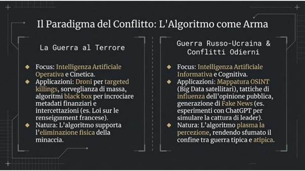Con l'invasione russa dell'Ucraina si è assottigliata la linea di demarcazione tra guerra "tipica", combattuta da eserciti su territori definiti, e guerra "atipica", come la War on Terror post-11 settembre. L'algoritmo è diventato a tutti gli effetti un decisore tecnologico. Mentre nella caccia al terrorismo la tecnologia aveva finalità prevalentemente operative (droni, uccisioni mirate, sorveglianza di massa), nei conflitti contemporanei in Europa e in Medio Oriente l'IA ha assunto un ruolo prettamente cognitivo e informativo.